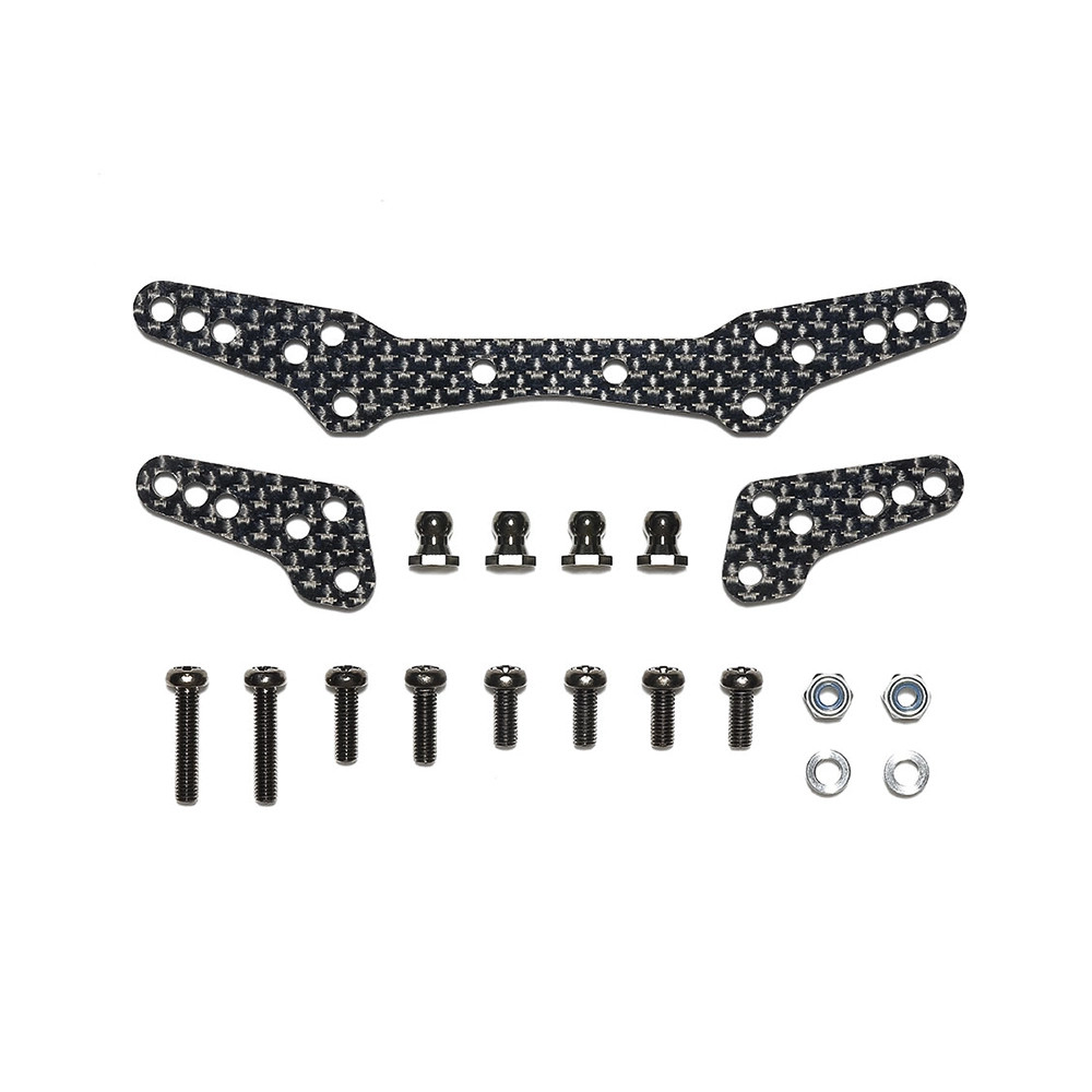 Supports d'amortisseur avant et arrière en carbone avec visserie pour châssis DT-04 de chez TAMIYA. Réf : 22094