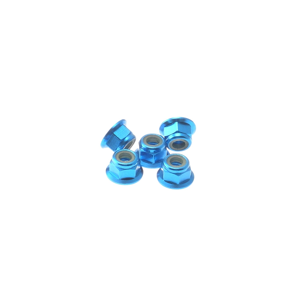 Un lot de 5 écrous épaulés nylstop en aluminium de 4mm, bleu de chez HIRO SEIKO. Réf : 69243
