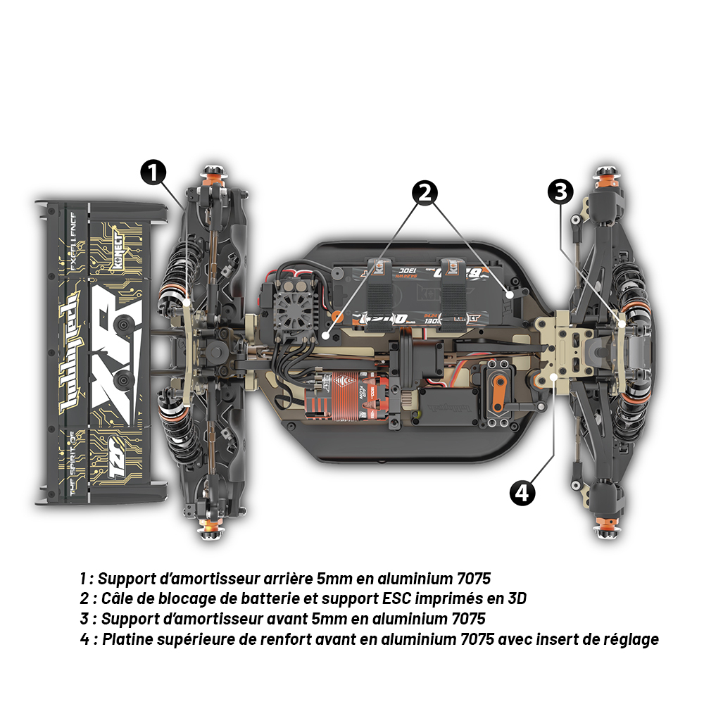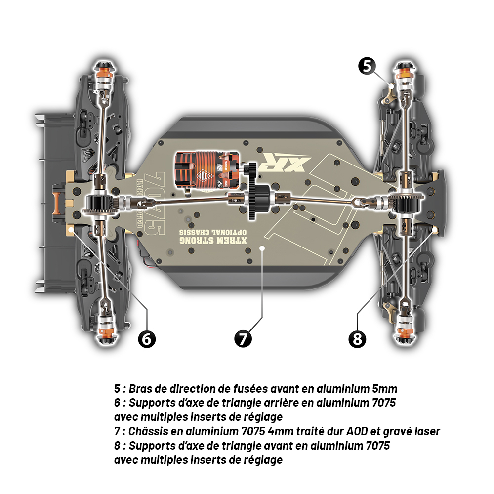 - Châssis en alu 7075 4 mm traité dur AOD et gravé laser.