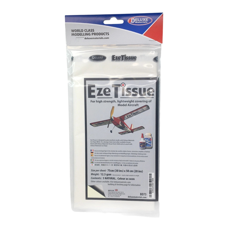 Le papier est prévu pour être appliqué avec la colle Deluxe Materials AD60, puis imperméabilisé à l’air à l’aide de plusieurs couches de Deluxe Materials Eze Dope BD42 pour un résultat optimal.