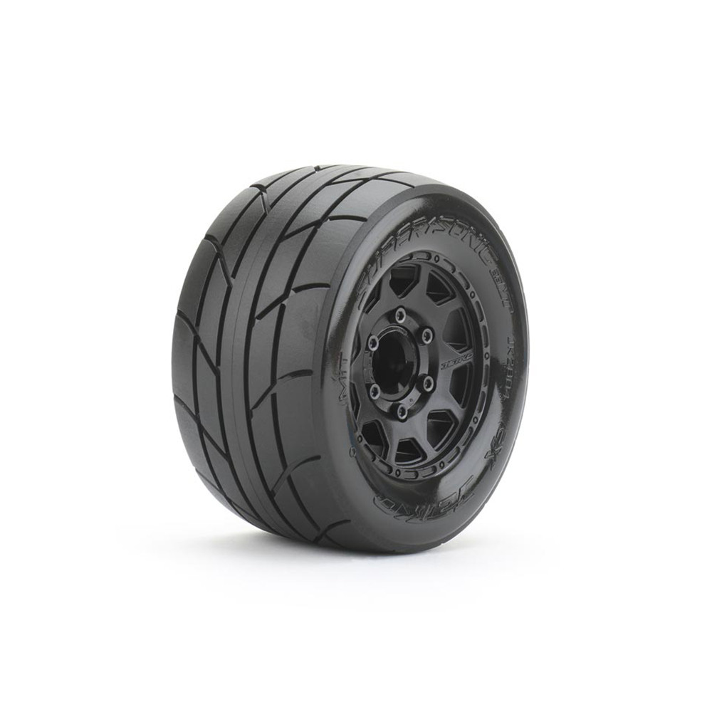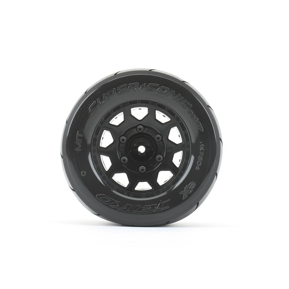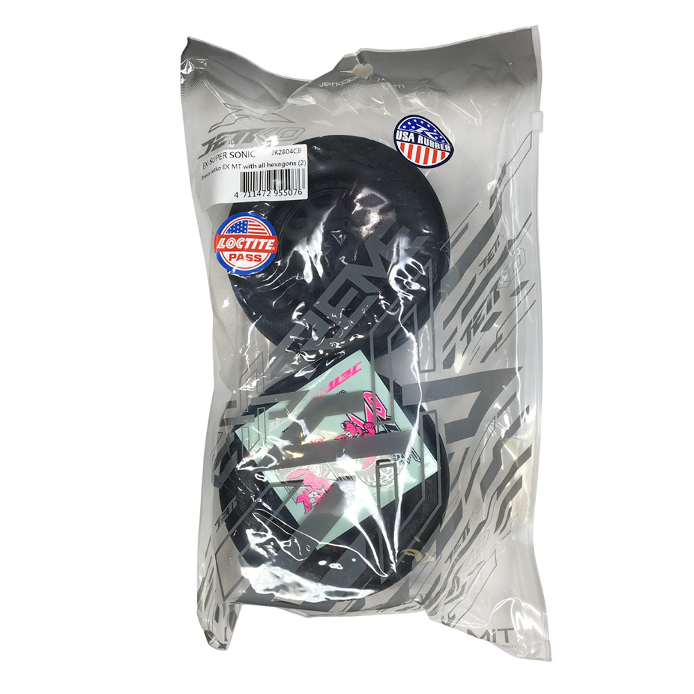 Une paire de roues avec pneus "EX MT Super Sonic" sur jantes noirs Hex.12, 14 ou 17mm de JETKO. Réf : JK2804CB